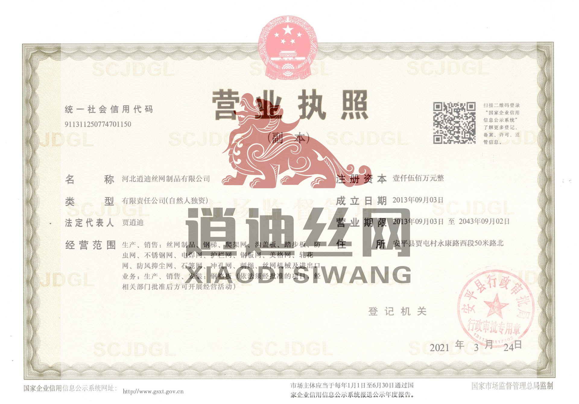 河北逍迪絲網制品有限公司誠信天下,誠信是我們公司一個原則問題不可撼動的,以心中有誠信的思想結交五湖四海的朋友,能達到雙贏是最好的,我們堅信朋友多了路好走,我們公司都是老朋友多,我們一直是這樣做的。河北逍迪絲網制品有限公司成立于2013年注冊資本壹仟伍佰萬整,主要生產沖孔網,鋼格板,金屬防蟲網,如實的實體廠家,是一家-研發-銷售-生產-安裝-售后一條龍公司,2019年通過了ISO 9001認證管理體系符合GB/T 19001-2016/ISO 9001:2015標準,同時通過了SGS認證,擁有商標版權2品牌,擁有一個著作版權,河北逍迪絲網制品有限公司位于中國有名的(絲網之鄉)安平縣,于天津,北京,雄安,石家莊相鄰,交通非常發達,出口可以選擇天津港口非常近每天都有接貨送貨往返車輛,空運可以選擇石家莊正定機場,附近也有鐵路運輸,當地還有兩個生態物流園區發往全國各地,我們沖孔網工廠生產設備有:普通沖壓機,高速沖壓機,自主研發小微孔沖壓機,龍門沖,磚塔沖孔,重型沖孔機,萬瓦級別激光切割機,3000W激光切割機,焊接設備,折彎機,校平機,剪板機,精密校平機,(對板面平整度要求苛刻的客戶群體0.5-0.2誤差)我們公司銷售市場沒有局限性國內國外都供應,擁有出口權...